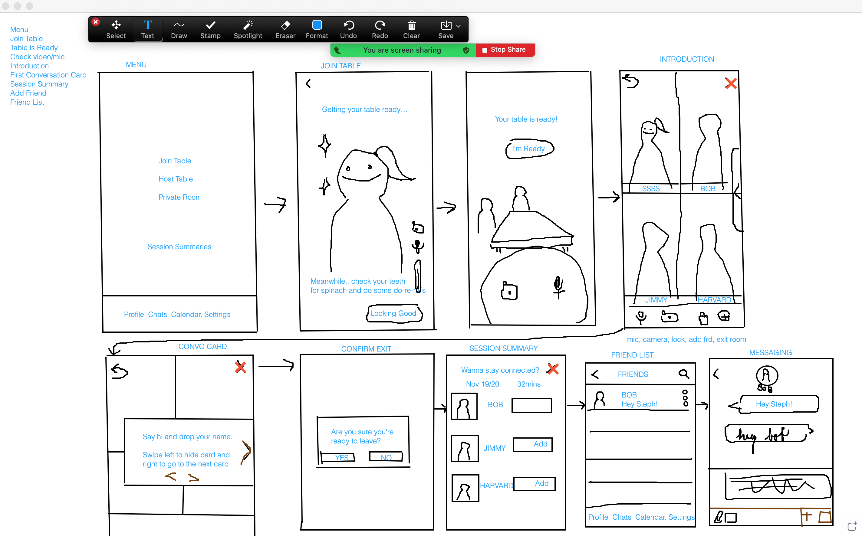 After the envision, we narrowed down the three basic flow around three user stories: joining a room, talking about conversation cards, and sending follow up messages.